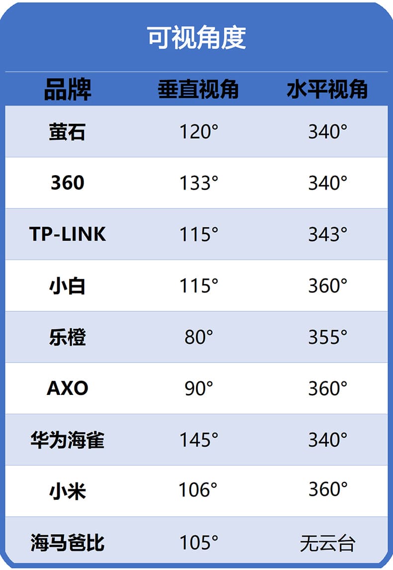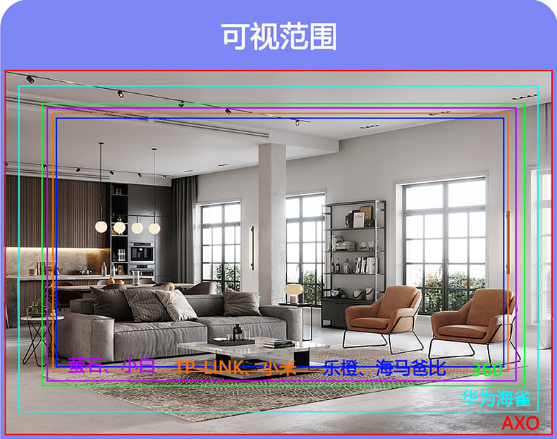 综合视角范围表现:AXO>华为海雀>360>萤石>小白>TP-LINK>小米>乐橙>海马爸比二、画质表现