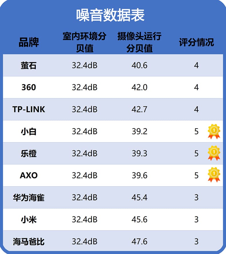 在相同室内环境分贝值32.4dB的情况下,测试结果显示摄像头运行分贝基本都在40dB-50dB,海马爸比的运行分贝值较大为47.6dB,小白、乐橙、AXO的运行分贝值较小,是比较安静的正常环境。