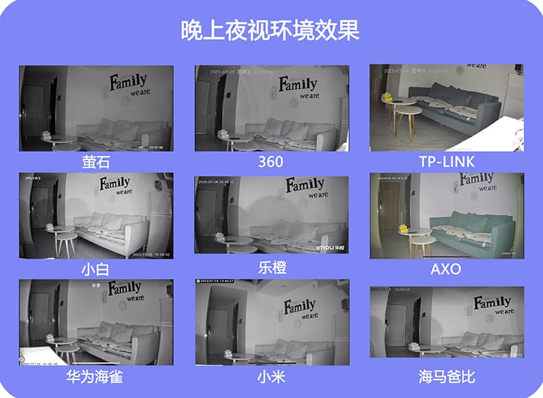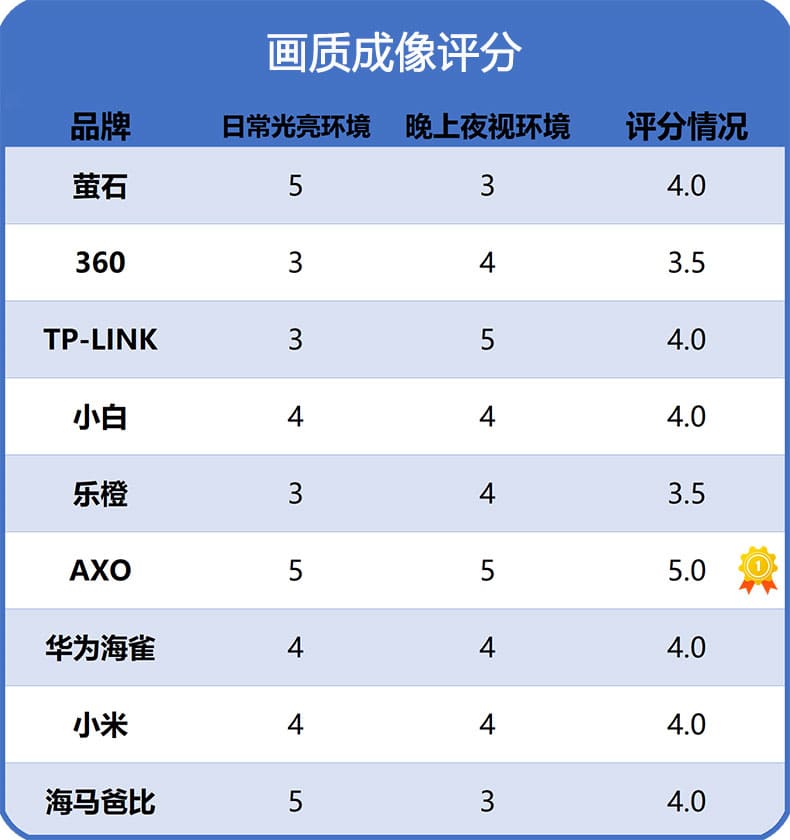 第三梯队:360和乐橙画质成像相对比其他几款弱;萤石在日常光亮环境表现不错,但晚上夜视环境就差一些,TP-LINK刚好相反且,因为具有白光照明(即闪光灯)功能。此外,小米、小白和华为海雀在两项测试中比较均衡!其综合表现最为优异的是AXO ,它在夜视组排名第一,真正做到了“夜晚也清晰”!在自然光组和无光照组表现也不差,并且具有夜视全彩功能。