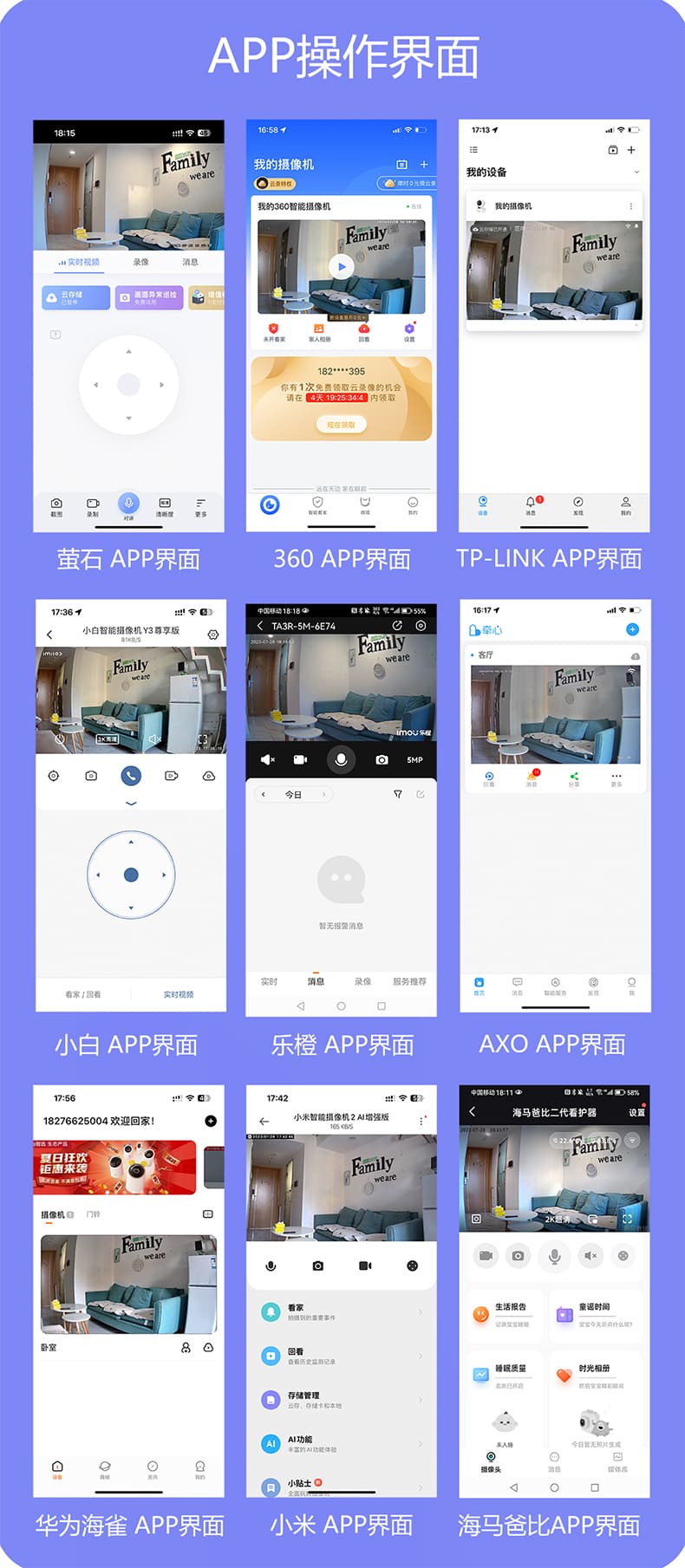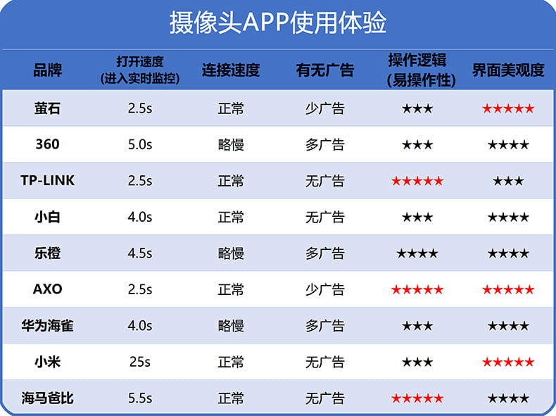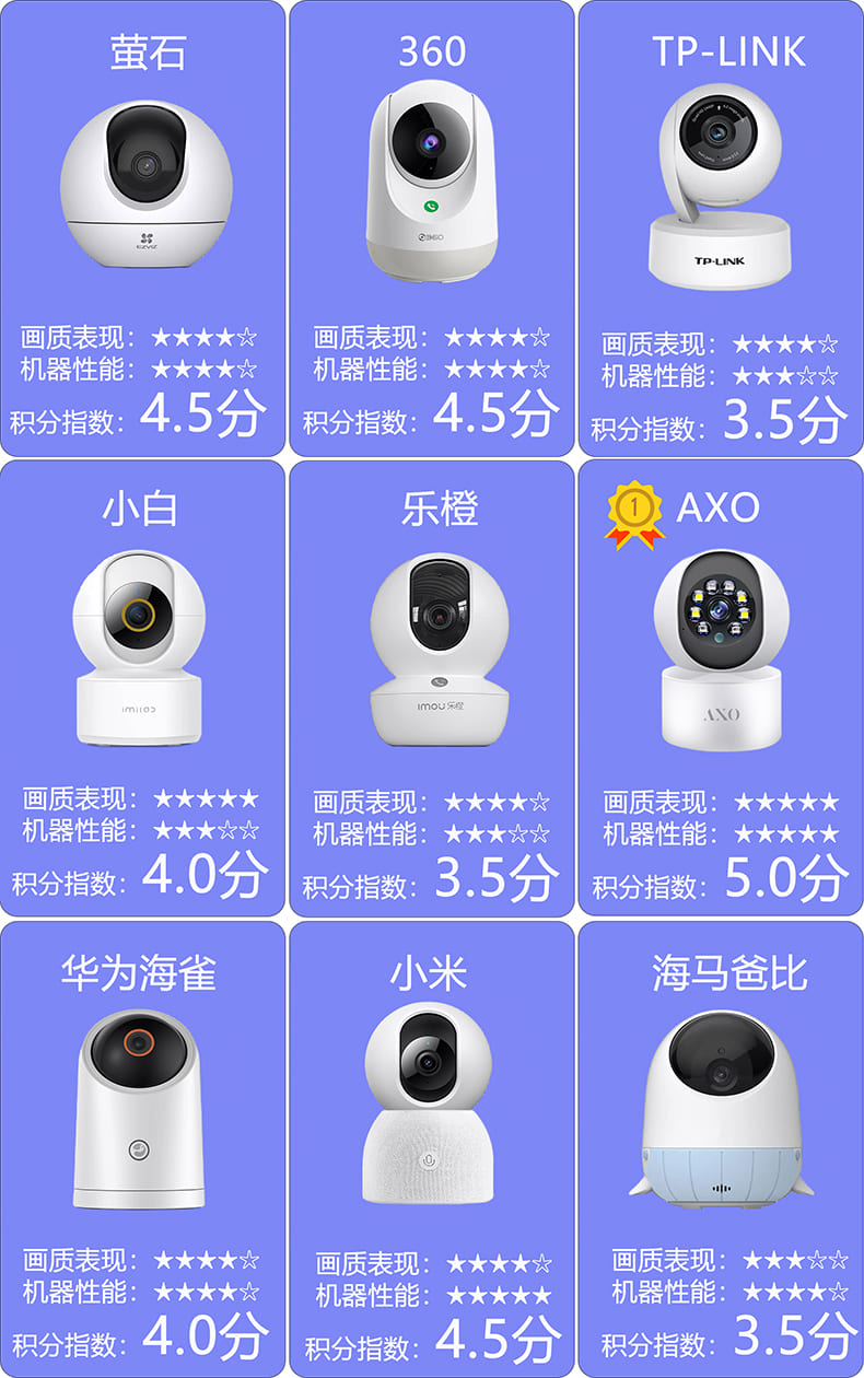 整体测试下来,这9款摄像头各有优势,其综合表现最优的是AXO。因为它不仅有着视野广、画质好、算力强的硬实力,产品搭载500万像素超广角镜头+强劲算力AI芯片,拥有更敏捷的追踪与识别功能,能够获得2K画质,实现全场景的AI看护,功能更全更优;海马爸比是一台儿童看护机,用它做安防是不推荐的,看护宝宝是可以考虑选择海马爸比的,它的睡眠监控等功能都很适合。萤石和海雀虽然偏科,但也各有特点,高清画质、超微光全彩、人脸识别、智能追踪、全天候看护等功能也都具备,大家可以根据实际需求进行选择。-本期评测已完结-