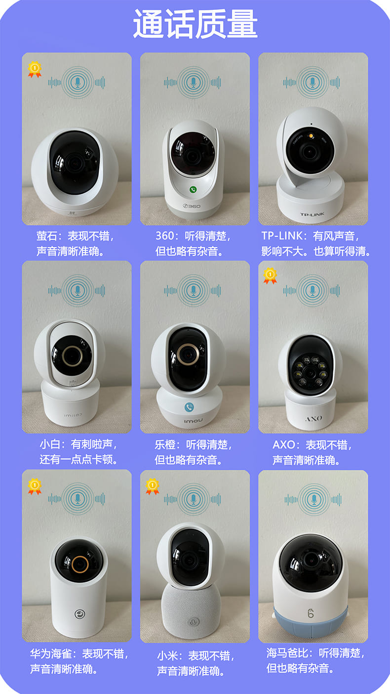 9款摄像头经过测试人员反复绕圈,每组做了10遍的追踪能力测试。发挥最稳定、表现最优秀的几款是:AXO以及360!其次是华为海雀、TP-LINK和乐橙基本还算能跟得上,海雀个别时候会出现莫名其妙的丢失人物的情况。最笨的,无论快慢都跟不上的是小米和小白,萤石C6的表现很迟钝,有些时候会出现追踪速度会慢半拍的情况,只有在检测到人脸时,才会跟着移动,要么直接”罢工“了。总体来看AXO在人形追踪表现的无疑是最优的,在测试过程中没有发现它出现跟不上的情况,从AXO摄像头记录的视频也能明显的看到,移动物体可以一直出现在画面的中间位置,这点确实很厉害!三、通话质量